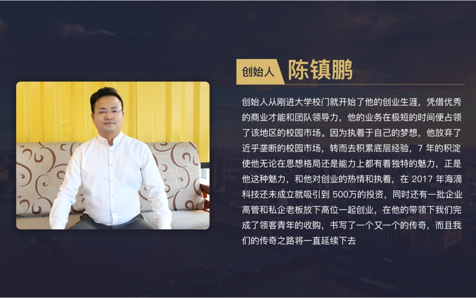 陈镇鹏广东海滴创始人兼CEO他18岁就励志成为企业家中的伟人,伟人中的企业家,大学时期已经开始创业,大一开始布局学校市场,大二组建了一帮团队,大三垄断了整个学校市场,毕业后手头有30多万的创业资金,没有马上选择去创业,而是去社会沉淀折服。